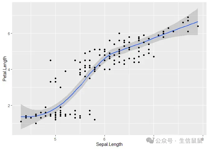 ggplot(data = iris, mapping = aes(x = Sepal.Length, y = Petal.Length)) + geom_smooth() + geom_point() #全局设置