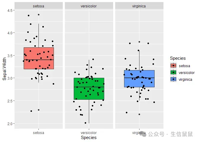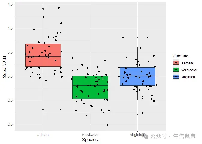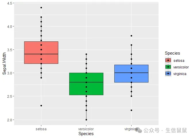 # 抖动的点图 ggplot( data = iris, mapping = aes(x = Species, y = Sepal.Width, fill = Species) ) + geom_boxplot() + geom_point()