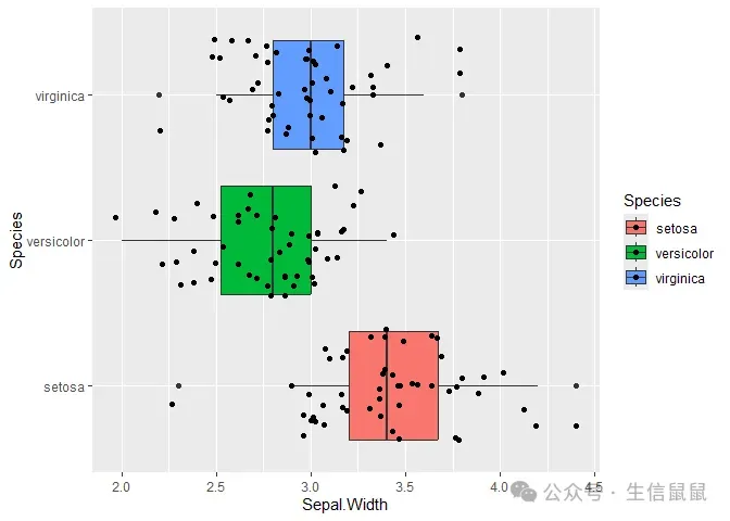 ggplot( data = iris, mapping = aes(x = Species, y = Sepal.Width, fill = Species) ) + geom_boxplot() + geom_jitter() + coord_flip() #颠倒x和y轴