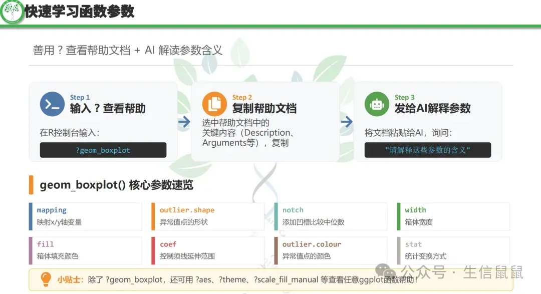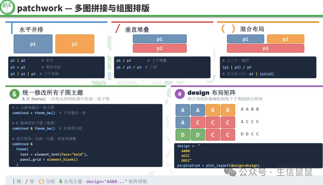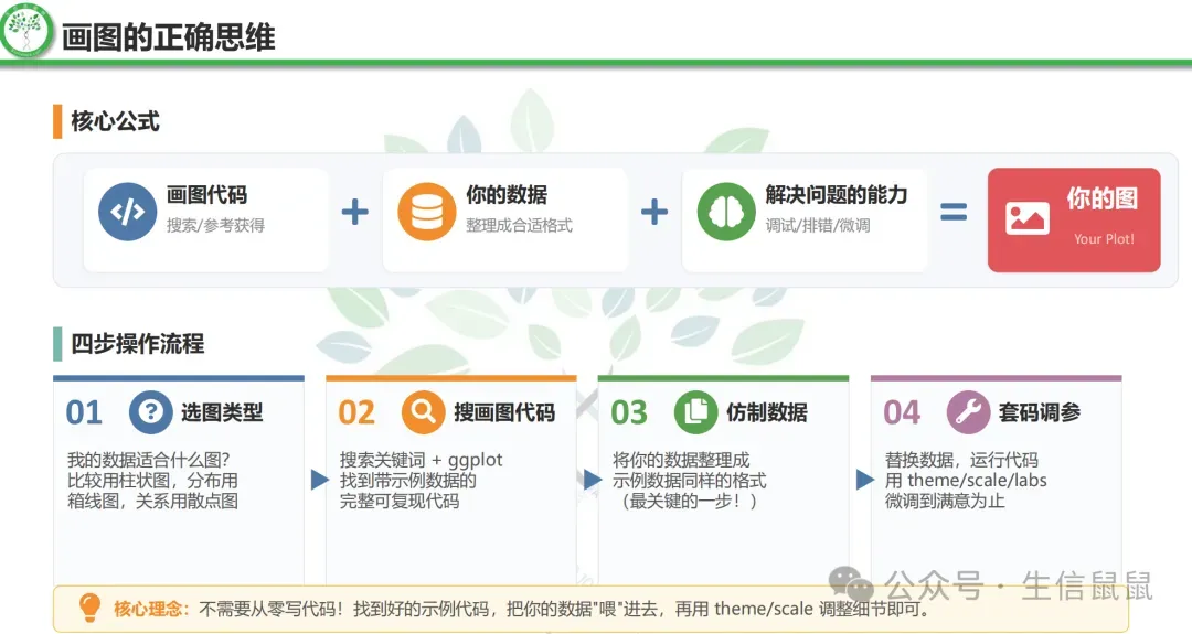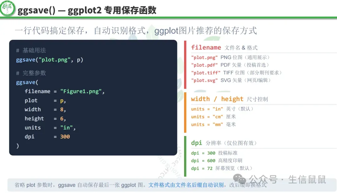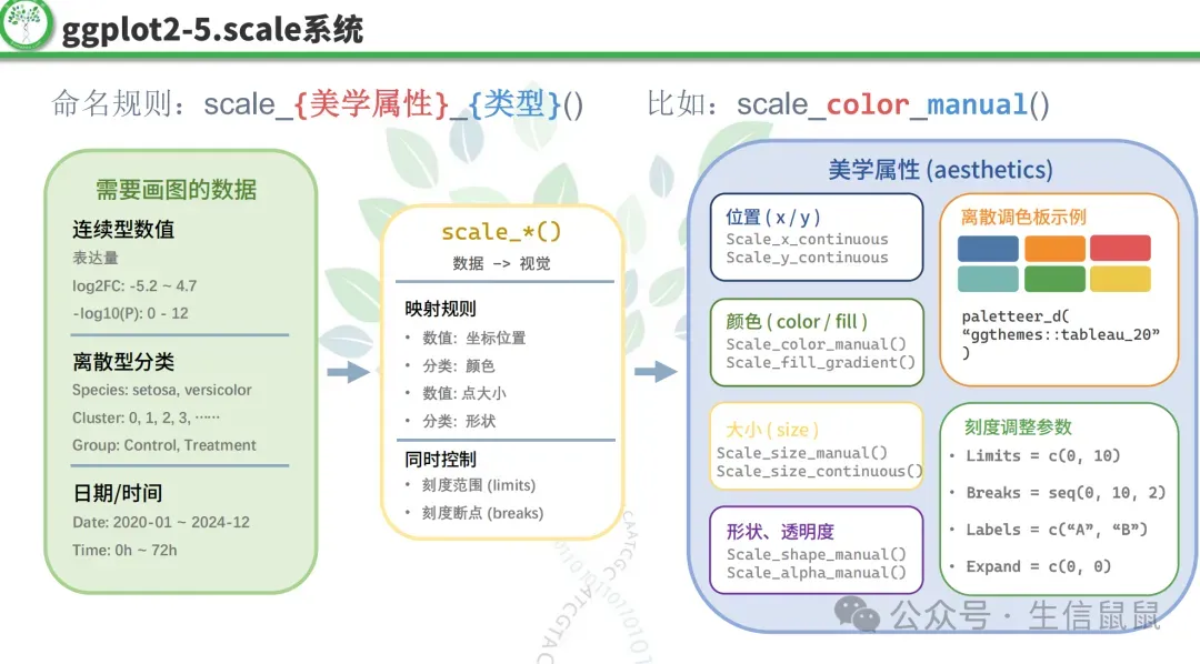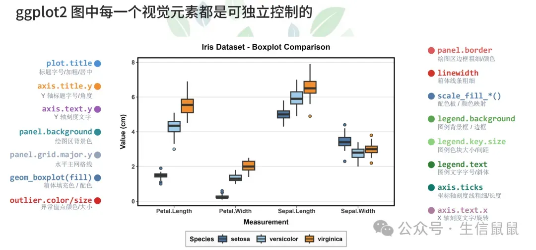 可以看到,ggplot2采用了分层的语法结构,允许我们通过添加不同的图层(如点图、线图、文本等)来构建复杂的图形,同时提供了丰富的主题和美学选项来定制图形的外观。这样就相对公式化,更适合去微调参数或者去效仿已经成功的案例。