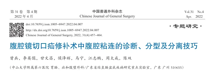 这篇文章由中山大学附属第六医院胃肠、疝和腹壁外科的曾兵、李英儒、甘文昌、陈双等撰写,发表于2022年,聚焦于腹腔镜切口疝修补术中一个极为常见但缺乏系统讨论的问题——腹腔粘连。切口疝是腹部手术后常见的远期并发症,而几乎所有经历过腹部手术的患者,腹腔内都会形成不同程度的粘连。在行切口疝修补时,分离腹腔内脏器与腹壁之间的粘连是放置补片的先决条件,也是手术中不可回避且有一定难度的环节。