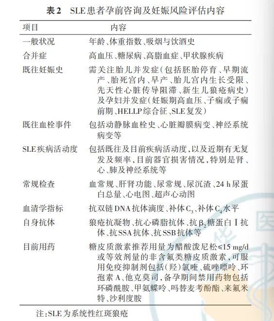 核心推荐:有生育需求的SLE患者必须常规行孕前咨询及妊娠风险综合评估,评估内容涵盖多维度指标,同时需向患者及家属充分告知妊娠风险,制定个体化妊娠监测计划。深度解读:孕前全面评估是预判妊娠风险、降低不良结局的基础,美国PROMISSE研究证实,SLE病情活动、既往狼疮肾炎病史、APLs阳性等是妊娠不良事件的核心危险因素,通过评估可针对性制定预防策略。- a.一般状况:年龄、体重指数(BMI)、吸烟/饮酒史;