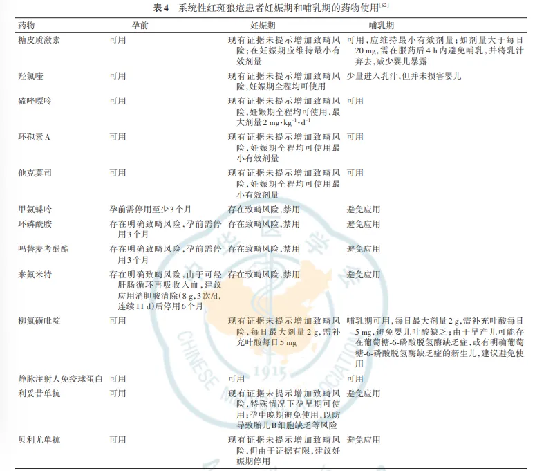 羟氯喹 | 可用,妊娠期全程服用者,产后继续服用 | 乳汁中浓度极低,无明确婴儿不良影响,且能降低产后病情复发风险 |