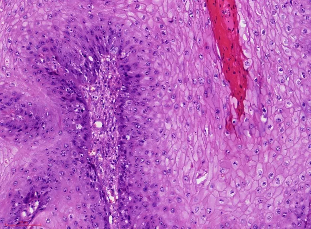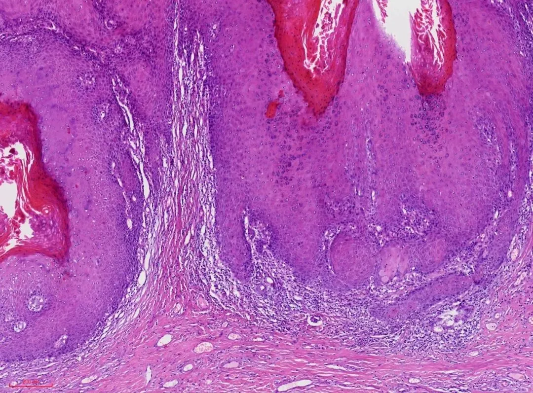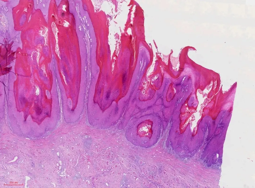 1.鳞状上皮增生,呈宽带状延伸并形成乳头状生长,纤维血管轴心无或纤细,乳头表面有角化过度和角化不全。棘层明显增厚,上皮角粗大,呈球状或棍棒样挤压推入上皮下间质。