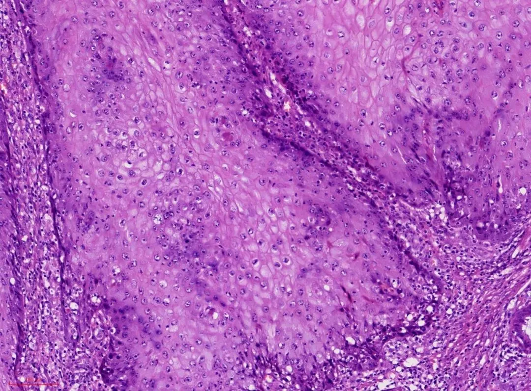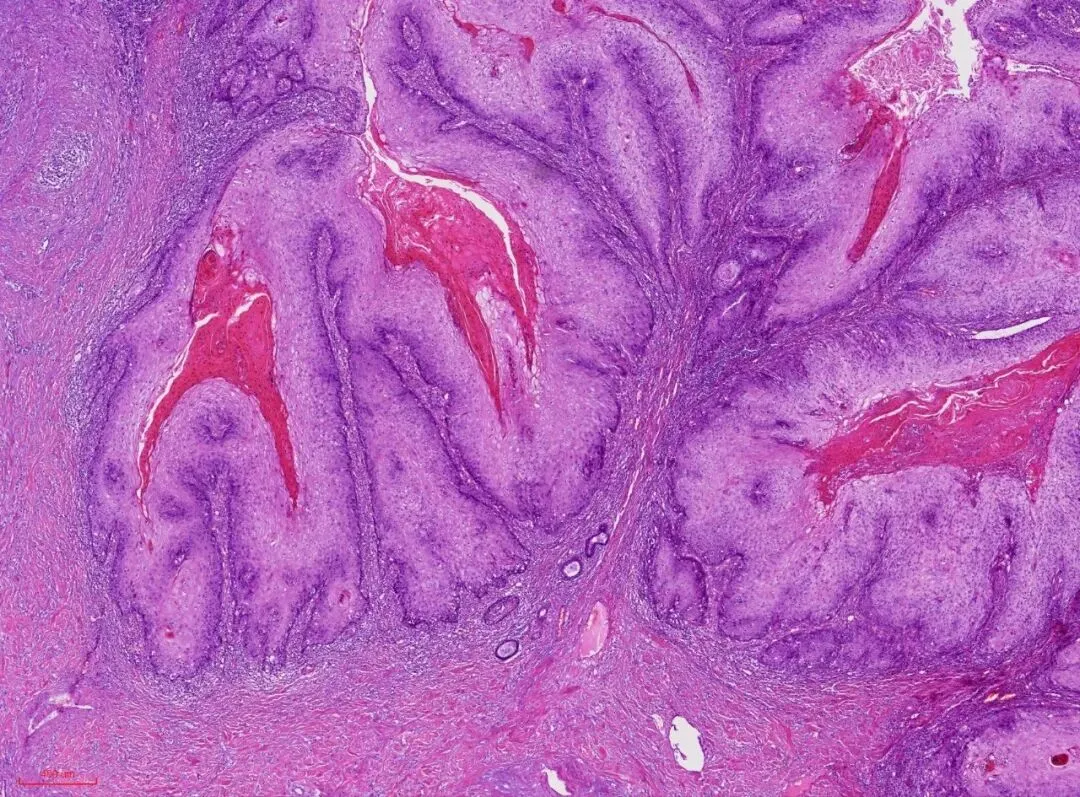 2.鳞状细胞癌:湿疣样癌是鳞状细胞癌的组织学亚型,表面也可有乳头状结构,有纤维血管轴心,乳头的鳞状上皮也有角化过度,与疣状癌最大的区别是细胞异型性明显,可见挖空细胞。肿瘤基底部不规则的插入组织周围。