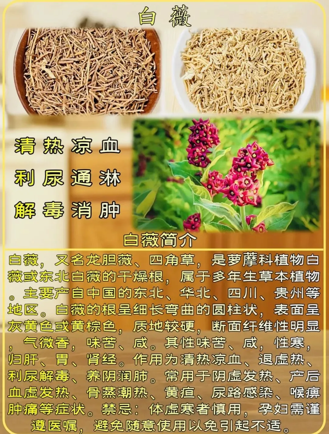 (5)配伍:白薇+玉竹 → 滋阴解表,治阴虚外感。