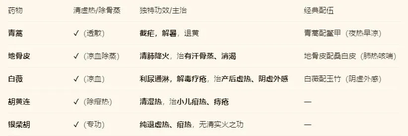 (1)青蒿 vs 地骨皮:都退虚热。青蒿辛散透热,治温病后期夜热早凉;地骨皮甘寒清降,治肺热骨蒸并见。
