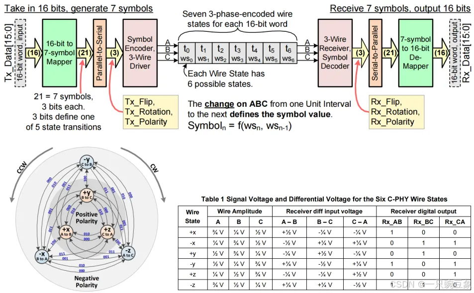 MIPI C-PHY的高速传输依据三相编码运作(Three-phase coding)原理,如下图所示,先从传送端到接收端数据传送的过程来说明C-PHY字节与通道状态的关系,C-PHY的高速数据传送首先是将16比特的数据字节通过16比特到7个字符(Symbol)转换模块机制转换,每个字符以3个比特来表示,因此内部形成一个21比特宽度的数据,再通过序列转串列的方式排成3比特的数据宽度以利于3线数据的处理,接下来再通过符号编码成3线码型(VA, VB, VC)输出,物理传输线上会将实际上使用的6个线状态(5个线状态转换)以三相编码的方式来表示,当接收端收到后,会以同样的方式将线状态解码出16比特的数据。