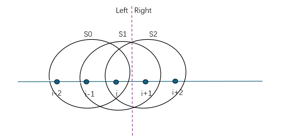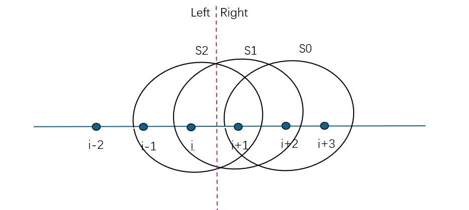 WENO格式是当前直升机高精度CFD模拟中应用最广泛、最具代表性的低耗散格式。其核心思想是通过一组候选模板的凸组合来进行非线性重构。每个模板对应一个低阶多项式,例如,对于5阶WENO格式(WENO5,r=3)而言,有3个候选模板,每个包含3个点,如下图所示