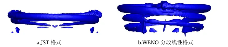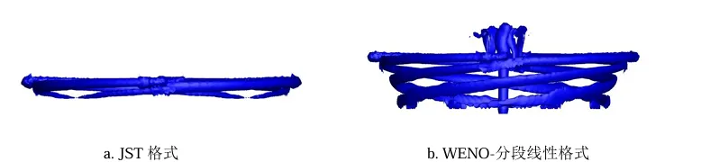 旋翼流场环境复杂,为准确模拟旋翼涡流场,不仅需要对前行侧桨叶激波/附面层干扰诱导的气流分离进行有效捕捉,还需要准确模拟旋翼桨尖涡等流动细节和涡干扰作用,而孤立旋翼流场是验证格式性能的基准算例。张居晖[3]将7阶Roe-WENO高精度格式应用于Caradonna&Tung旋翼悬停流场的数值模拟和Helishape 7A 旋翼悬停流场数值模拟,结果表明利用其发展的7阶WENO格式计算出的桨叶表面压力系数与实验值吻合良好,此外,从模拟效果可以看出,与JST格式相比,WENO-分段线性格式对桨尖涡的捕捉和涡强度的计算能力更好,如下图所示。