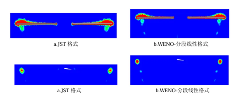 在传统的WENO格式的基础上,Jiang和Shu[1]提出了经典WENO-JS格式,奠定了WENO的基本框架;Borges等人[2]通过引入全局高阶光滑度量指标,对权重进行了优化,提出了WENO-Z格式,该格式旨在解决经典WENO-JS格式在光滑流场区域存在的数值耗散偏大和在极值点处精度下降的问题。WENO-Z格式通过一个更优的权重设计,在保持激波捕捉鲁棒性的同时,显著提升了格式的分辨率和计算精度,在捕捉涡等光滑但剧烈变化的流动特征时更具优势。