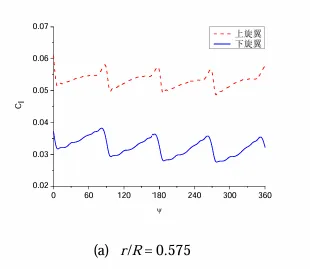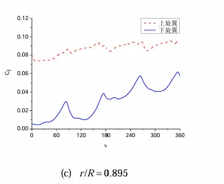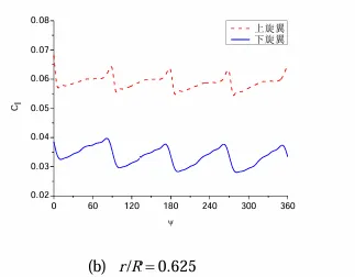 张昆[4]针对X2高速直升机的共轴双旋翼,采用了基于运动嵌套网格技术和低耗散Roe-MUSCL格式的CFD方法,对悬停状态共轴刚性双旋翼的气动特性进行了模拟,得到如下结论:1)在悬停状态下,与单旋翼的桨叶剖面升力系数不随方位角变化不同,共轴刚性双旋翼的桨叶剖面升力系数是非定常变化的(如图7所示),这是因为共轴双旋翼的上下旋翼桨叶相互干扰所致。2)此外,根据图 8 可知在不同方位角下,下旋翼的拉力系数都比上旋翼的小,且上下旋翼在一个计算周期内均出现了4个波峰,波峰位置分别位于90°、180°、270°、360°方位角,而且在出现波峰的位置振幅较大,这表明高速旋转的上下旋翼桨叶在彼此相遇时产生了强烈的气动干扰。