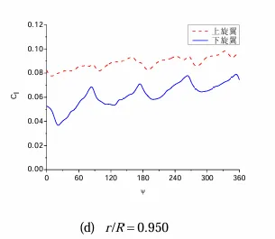 图7 悬停状态下不同位置处共轴刚性双旋翼的桨叶剖面升力系数随方位角的变化