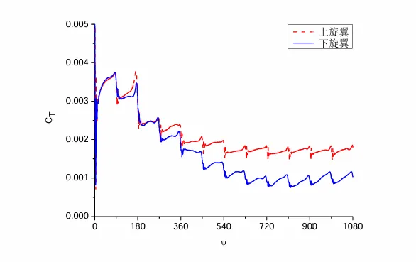 图8 悬停状态下共轴刚性双旋翼的拉力系数历程