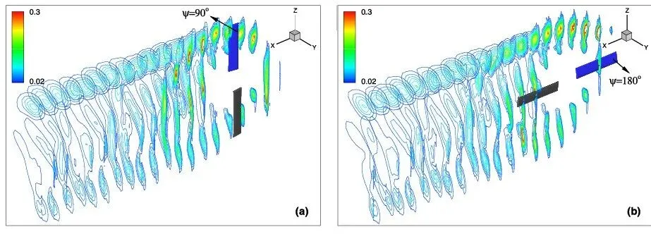 相比于悬停状态,直升机前飞时的流场更为复杂,涉及周期变距、动态失速和尾迹的斜向拖出。Li[5]在前飞旋翼的高阶方法研究中,采用移动重叠网格技术结合五阶WENO-Z格式,成功模拟了前飞状态下旋翼的非定常气动载荷和复杂的尾迹涡系结构(如下图所示),计算结果与实验数据吻合良好。这证明了高阶低耗散格式在复杂运动和非定常流动中的适用性。计算结果还表明,其引入的移动重叠网格技术和第五阶WENO-Z 方案在高分辨率捕捉涡尾方面具有很强的能力(相较于MUSCL格式和WENO-JS格式)。