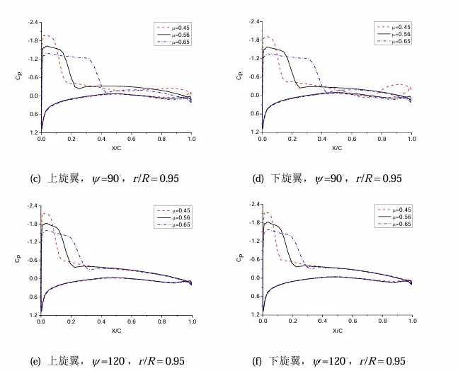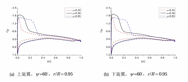 张昆[4]在对高前进比前飞状态下高速直升机共轴刚性双旋翼的气动特性进行分析时,研究了前进比变化对共轴刚性双旋翼气动特性的影响,发现上下旋翼的拉力系数随前进比的增加而增大,且趋于相等,并且它们的功率系数随前进比的增加亦增大;根据前行侧不同方位角处的桨叶表面压强系数沿展向的分布情况(如图11所示),发现上下旋翼的桨叶尖部在60°~120°方位角处均产生了较强的激波,这表明上下旋翼的桨盘前行侧大部分区域都会出现较强的激波,且随着前进比增加,激波位置向桨叶后缘移动,该结论与物理实际相符合。