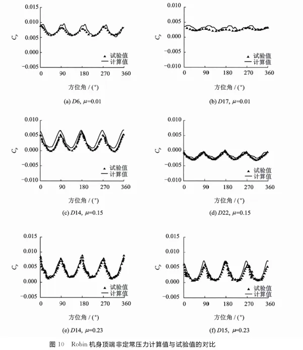 图15Robin机身顶端非定常压力计算值与试验值的对比