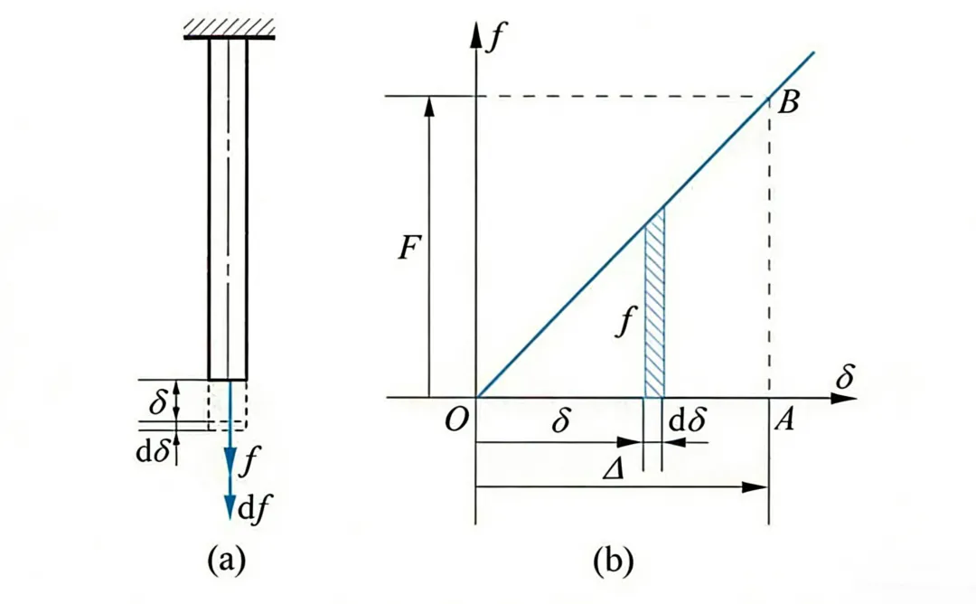 图(a)所示杆,承受轴向载荷作用。载荷f由零逐渐增加,最后达到最大值F;载荷f作用点的相应位移δ也随之增长,最后达到最大值。在线弹性范围内,载荷f与位移δ成正比,其关系如图(b)所示。