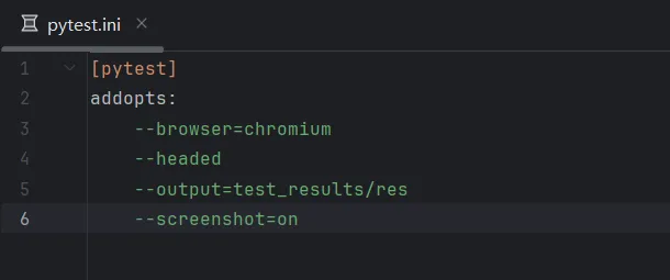 今天的学习,将会解决前面遗留的问题,同时,也会提供一个UI自动化中很常见的配置文件。还是和之前一样,解决之前遗留的一个问题:playwright的无头模式关闭,之前我们有两种不是通用的方式:命令行和pycharm改设置的方法。今天彻底解决这个问题。解决方法就是pytest.ini文件。创建一个pytest.in文件,然后输入下面的配置即可:[pytest]addopts: --headed