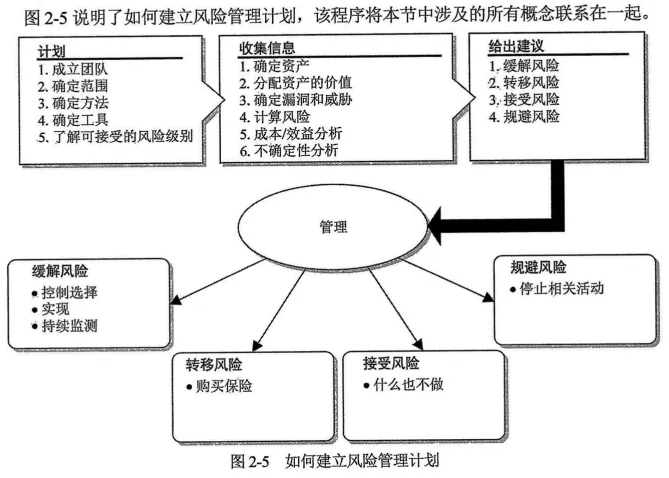 风险管理从组织层的决策开始,向下流动到其他两层。而有关这些决策效果的反馈则会向上流动,通告下一组要做出的决策。正确实施风险管理意味着全面了解组织自身、组织所面临的威胁以及可实施的应对这些威胁的安全对策,并持续监测以确保风险始终处于可接受的水平。