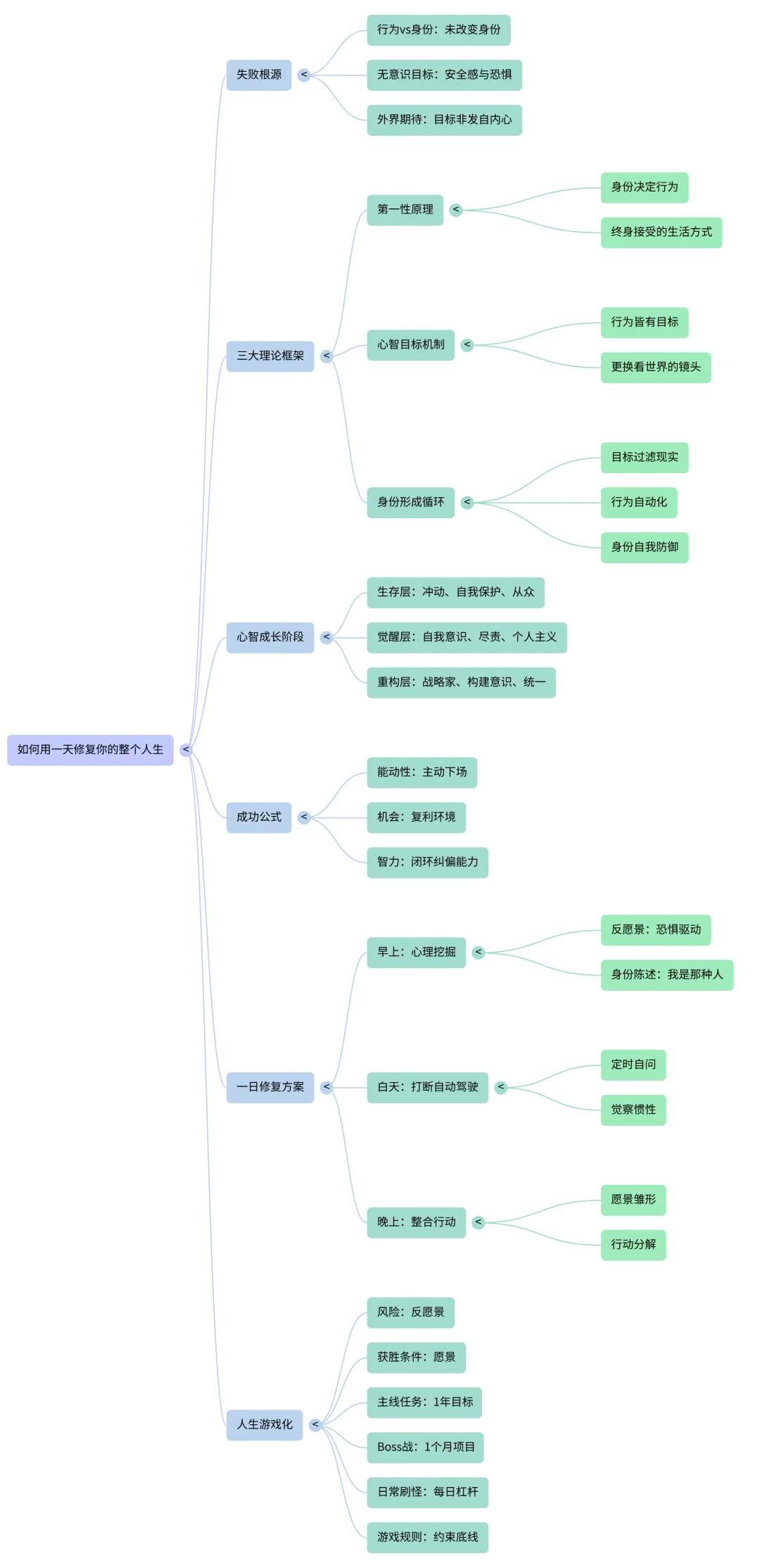 真正的改变始于身份重塑,而不是立目标、靠自律。路径是:用深度自我挖掘建好「反愿景」(你最不想成为的样子)作驱动力 → 用定时自问打断无意识惯性 → 用游戏化框架(反愿景 / 愿景 / 一年目标 / 一月项目 / 每日杠杆 / 约束)把新身份放进每一天。成长会经历觉醒 → 混乱 → 重构,不是线性进步,但会变成自主、自然、可持续的过程。