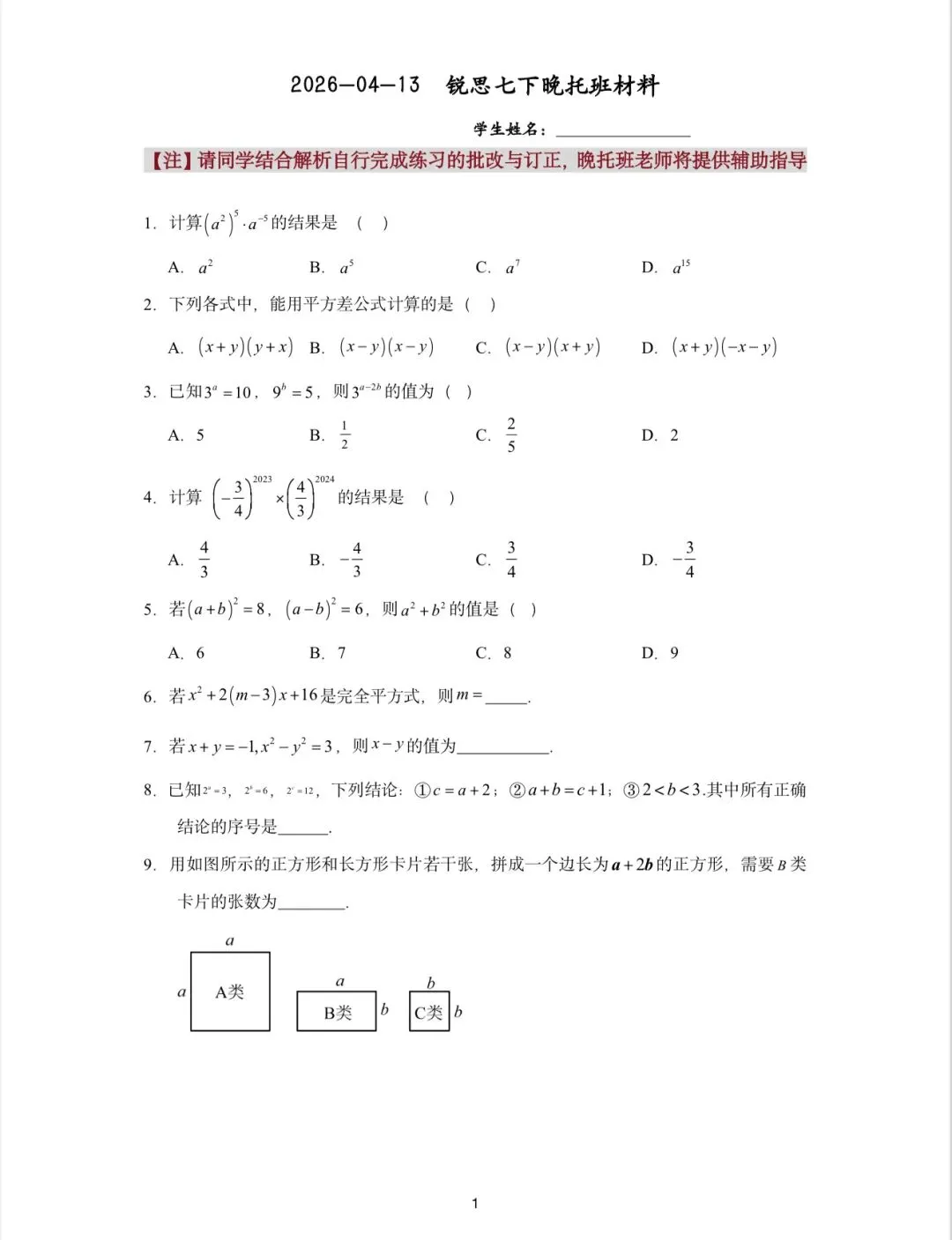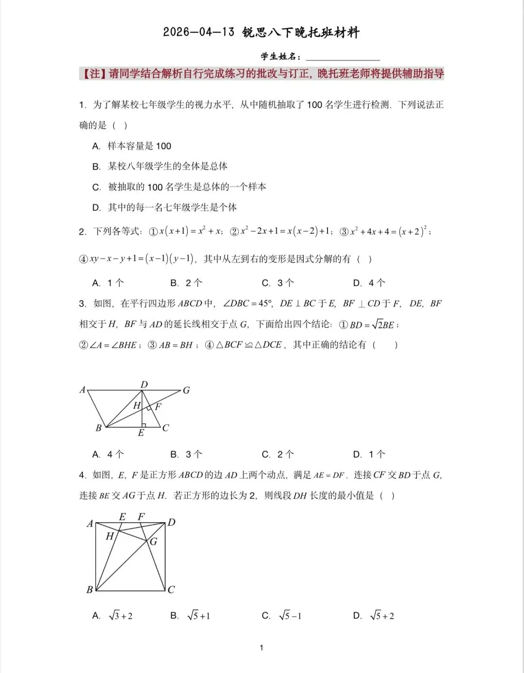 从周一到周五,我们每日精心准备专属晚托学习资料,完全贴合孩子当前学习情况,紧扣课本重点、课堂易错点、单元必考点,当天学、当天练、当天巩固。七年级夯实计算与整式运算,八年级突破几何、因式分解难点,九年级聚焦中考高频考点与综合题型,不搞题海、不瞎练,让孩子每晚都练在关键点上。