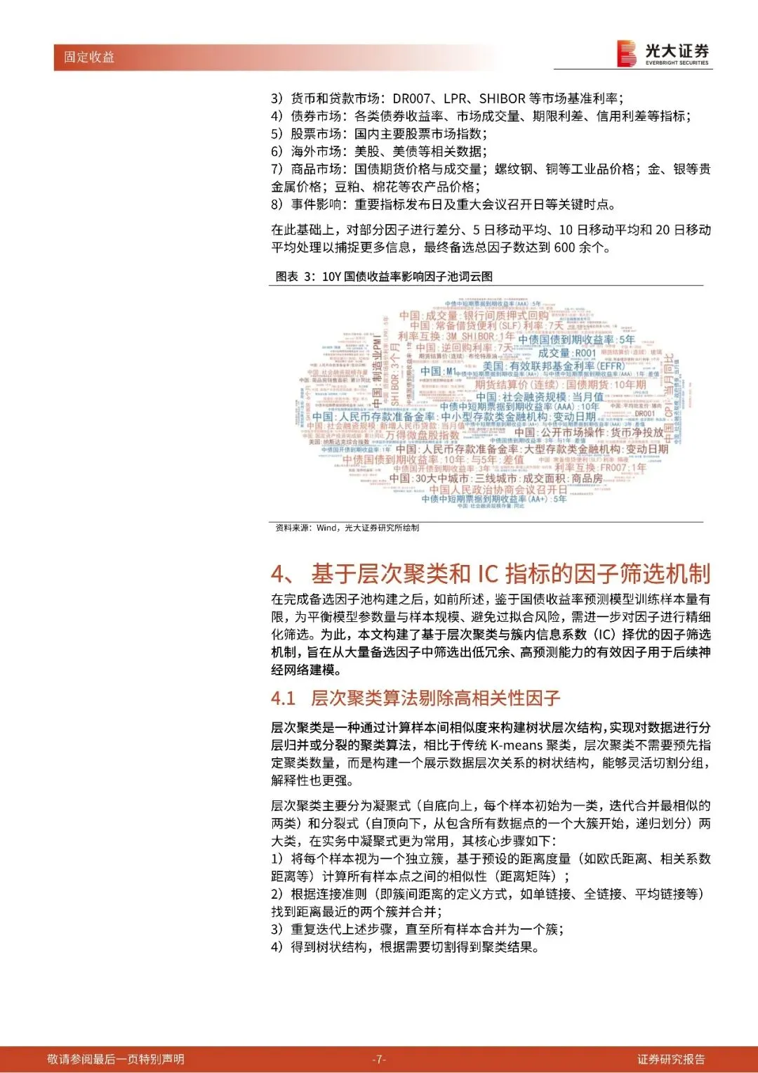 本篇报告为光大固收团队量化学习笔记的第三篇,基于对前期研究究的持续优化,我们正式发布基于神经网络算法的十年期国债收益率周度预测模型。模型基于层次聚类算法与簇内信息系数(IC)择优构建因子筛选机制,以未来5个交易日后的中债十年期国债收益率的涨跌方向为目标变量,搭建动态训练的神经网络分类模型,实现模型参数随时间滚动更新。模型对2026年1月4日起的10Y国债收益率进行逐日滚动实测,截至2026年3月27日,样本外漂测试集单日预测胜率达73.68%。