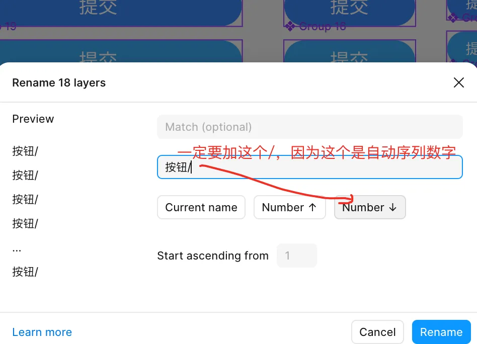 给组件命名(组件快捷键Ctrl+R),在命名时一定加上“/”点击Number,之后按钮就自动命名好了(看图效果圈红的地方)。