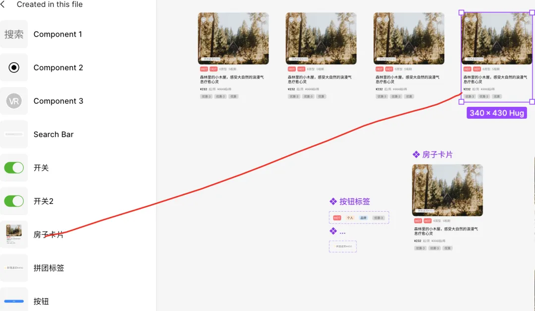 通过组件变体,做重复的样式操作,可以节约很多的设计时间。这里的房子卡片就是从组件里面直接应用的。