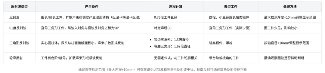- 三角形反射波:纵波检测实心圆柱体时,探头平面与柱面接触面积小,声束扩散会形成三角形反射。不发生波形转换形成等边三角形,回波声程为工件直径 1.3 倍;发生波形转换形成等腰三角形,回波声程为 1.67 倍。两种反射波位于第一次底波之后、第二次底波之前。通过调整检测范围可避免其干扰,如按轴直径加 10 毫米调整。