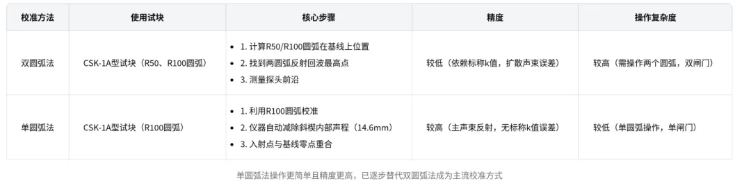 - 方法比较:单圆弧法比双圆弧法少用一个闸门,少找一个 R50 圆弧反射回波,操作简单,精度更高。双圆弧法校准存在误差,因 R50 圆弧反射回波可能由扩散声束得到,且计算公式中 k 值为标称值,存在误差。