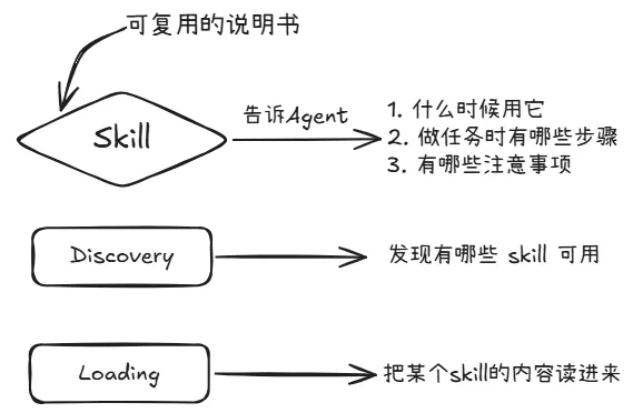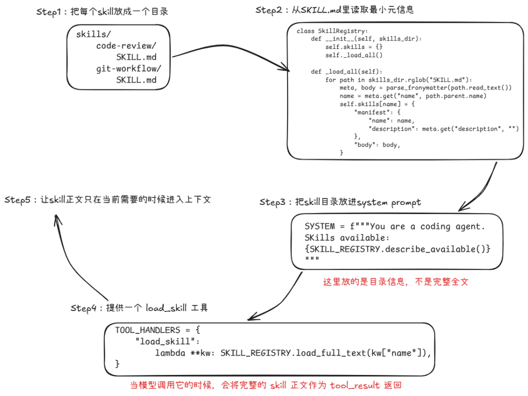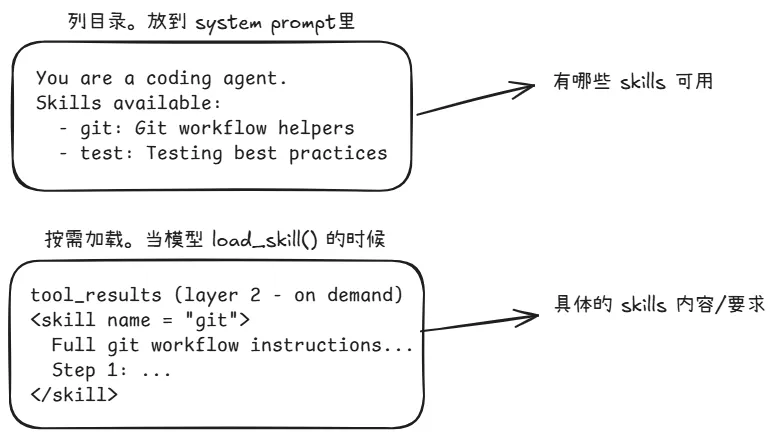 核心逻辑是:system prompt 中仅包含简短的 skill 元数据,当 Agent 发现需要特定专业知识时,再通过 load_skill 工具按需加载详细内容。