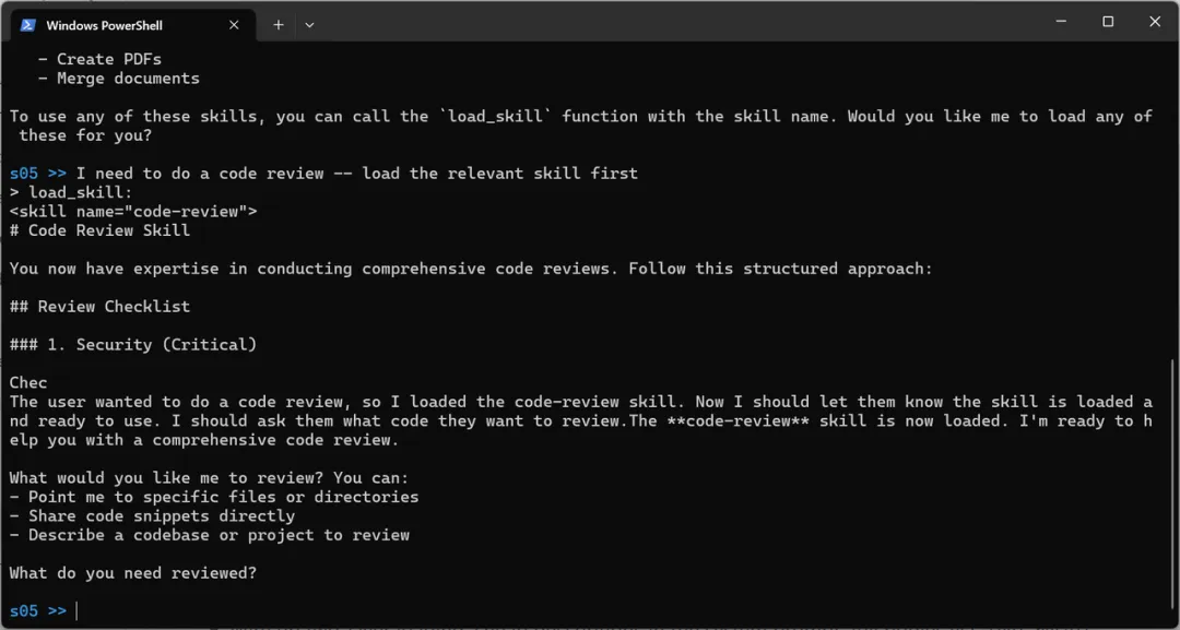 我们让它【加载一下做代码审查的skill】