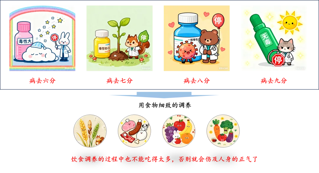 治病用药要适可而止,病好得差不多就停药,剩下靠饮食调养恢身体,别把身体正气伤了