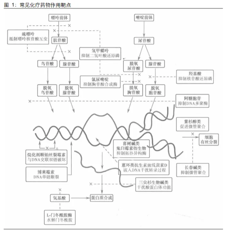 微管蛋白抑制剂,通过抑制细胞微管组装,阻断有丝分裂,使癌细胞凋亡,包括长春碱、单甲基Auristatin E(MMAE)和单甲基Auristatin F(MMAF)、Maytansinoids美登素类化合物如DM1、DM3、DM4等。微管蛋白抑制剂对于活跃分裂的肿瘤细胞非常有效,但对于静息状态的肿瘤细胞效果并不理想。