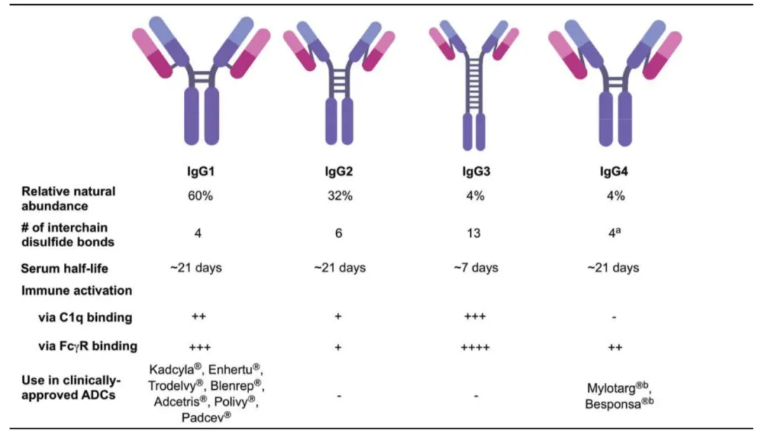 ③较长的体内半衰期:绝大多数在研ADC均采用IgG骨架,因其循环半衰期长。IgG1和IgG3对比IgG2和IgG4具有更强的ADCC和CDC效应,可以增强ADC对肿瘤细胞的杀伤作用。而IgG3分子在循环中的半衰期较短,难以满足临床使用中对于给药周期的要求,所以IgG1是目前最常用的亚型。