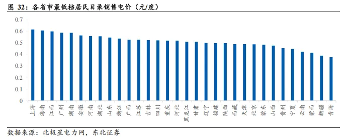 2015年后,国内用户用电价格分为居民生活、农业生产及工商业用电3类,个别地区工商业又可以细分为大工业及一般工商业用电,居民生活和农业生产用电执行目录销售电价政策,最低档居民目录销售电价介于0.3771元/度(青海)和0.617元/度(上海)之间,农业生产电价按电压等级定价,低于当地居民目录销售电价。