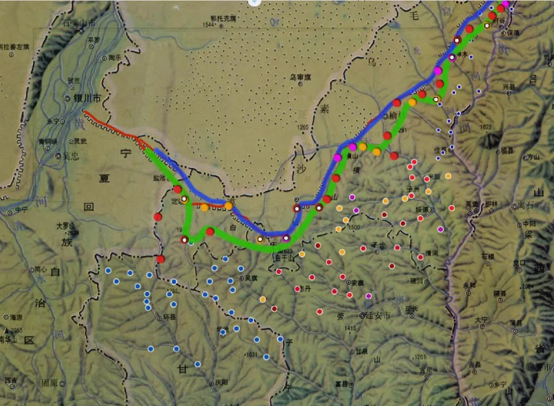 二“墙,城,堡,营,寨”等地名。地名中带有的“墙”字通常是长城的意思。古时候的吴起人通常管长城叫“边墙”,所以吴起的地名中有头道墙、二道墙、三道墙的叫法,府谷地名中也同样有墙头等字。春秋战国时期,秦国为抵御北方匈奴,在陕北等地修筑了长城。秦始皇统一六国后,在原有古城墙的建造上加以修筑,形成了大规模的防御工程即“万里长城”。明朝时期在此基础上又对长城进行了四次整修,以防外侵。明成化年间延绥巡抚余子俊监修长城,被称为“二边”;后期到了弘治年间,延绥巡抚文贵又在明朝所修建的长城外围,继续筑了一道边墙,后称为“大边”。所以今天人们所说的头道墙,二道墙就是指上述的两条长城,而三道墙则是指秦朝时期修筑的长城遗址。北宋时期,西夏势力空前强大,多次大举南下攻宋,北宋抗击西夏人侵的三次大战,三川口、好水川、定川堡之战皆惨遭失败,宋廷开始采用范仲淹提出的“堡寨政策”,逐渐形成了在东起河东路麟州(治今陕西神木县北)、府州(治今陕西府谷)、丰州(治今府谷西北)、晋宁军(治今陕西佳县)‚经陕西鄜延路的绥德军(治今陕西绥德县)、延安府(治今延安市)、保安军(治今陕西志丹县 )、环庆路的庆州(治今甘肃庆阳)、定边军(治今陕西吴起县西北)、环州(治今甘肃环县)、泾原路‚西至秦凤路和熙河路各州军‚大大小小的堡寨鳞次栉比。统计资料显示陕北地区已经发现并确认北宋时期的城堡寨有 117个‚其中城52个‚有寨55个‚有堡10个。主要分布在今榆林延安两市。如在鄜延路保存比较好的有安定堡,位于子长县安定镇;承平寨,《宋史·狄青传》载‚北宋初筑承平寨于此‚系当时延州东路防御要塞‚后易名永平寨;德靖寨:位于旦八镇城台村;顺宁寨:在顺宁乡杏树崖根与驸马沟门之间。保安军城,即今志丹县城。除个别原堡寨的名称被完整保留并沿用,如暖泉寨,个别堡寨转变为村镇,如顺宁镇,但遗憾的是大部分已消失了。