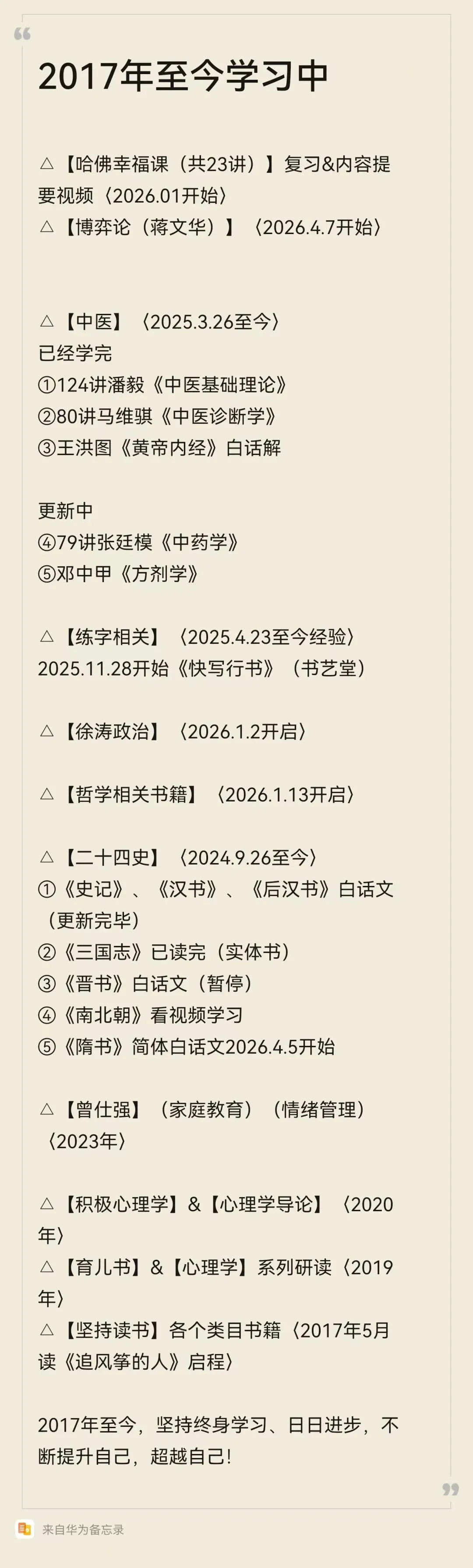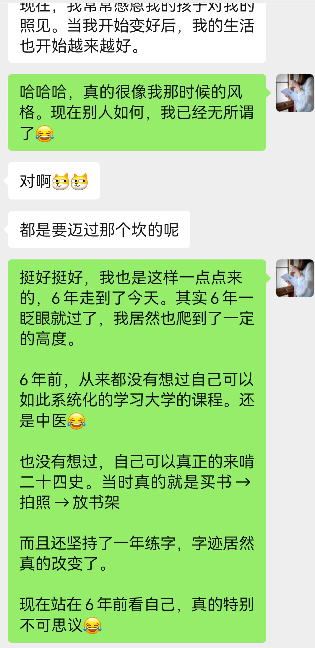 更没想到的是,这种纯粹的学习状态,不知不觉吸引了一些志同道合的小伙伴。大家各自忙碌,却在同一个角落里默默努力。有人跟着学中医,有人开始啃历史,有人重新拾起练字的笔……我们彼此激发,彼此见证。在平凡的生活里,找到一个安静的角落,让自己不断成长——这大概就是最踏实的幸福吧。