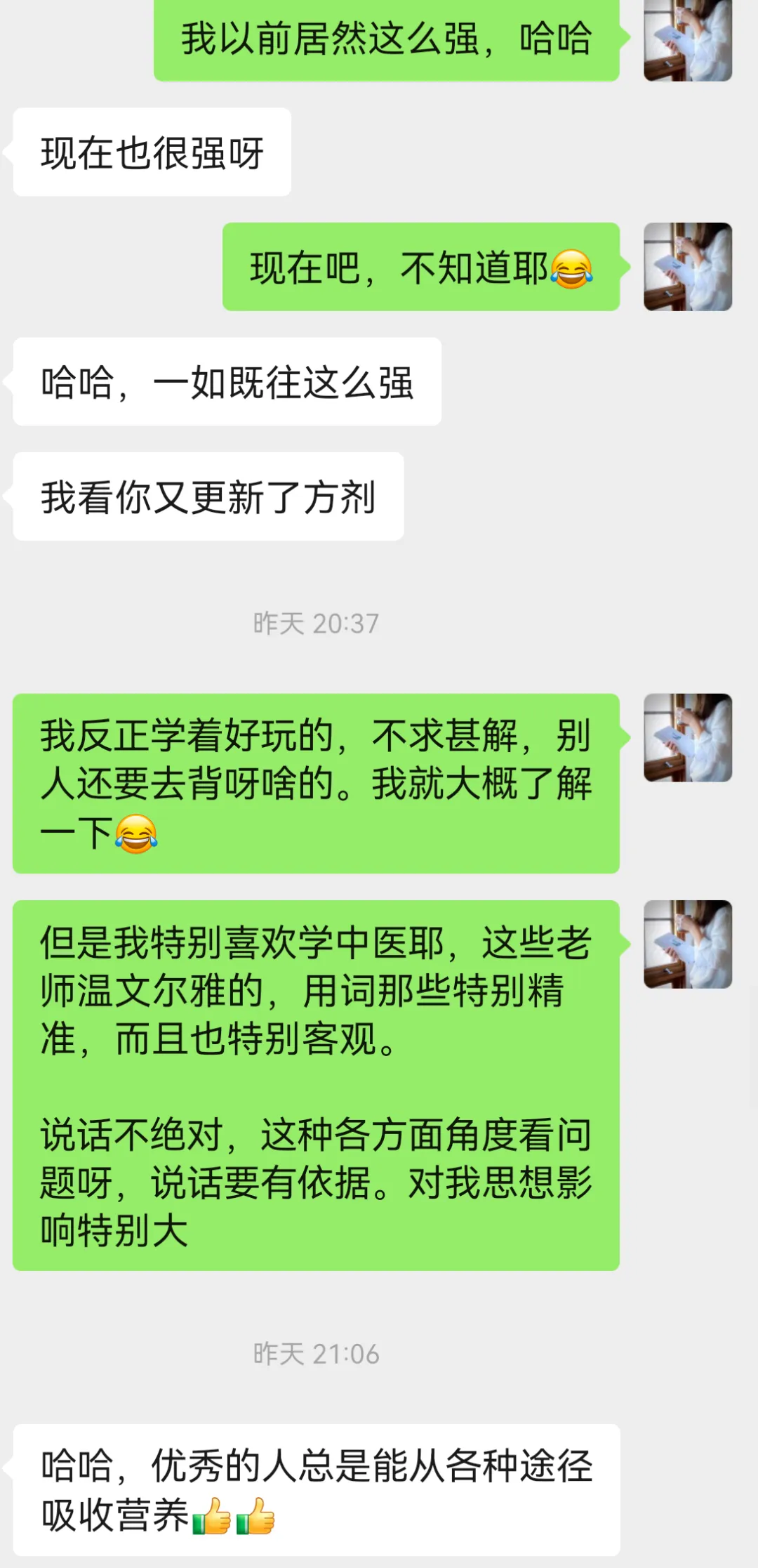 这些年我也见证了你从读大学考研,到结婚,还当上了中医老师,到处坐诊。我自己学习中医的时候,总是感受到你这一路上学习的艰辛和不易。