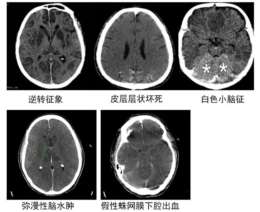 脑水肿和颅内压增高导致脑实质密度减低,而静脉结构充血扩张,从而出现蛛网膜下腔似出血的高密度影。在20%心肺骤停后的患者中可发生,通常在复苏后3天内,表明严重的脑损伤提示预后不良。