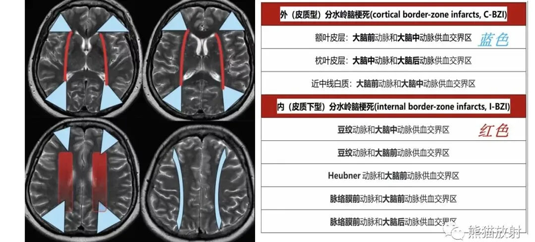 包含两类,分别为皮质分水岭(大脑前动脉-中动脉、大脑中动脉-后动脉交界区的皮质和邻近的皮质下白质),以及内侧分水岭(大脑半卵圆中心及放射冠区的深部白质)。