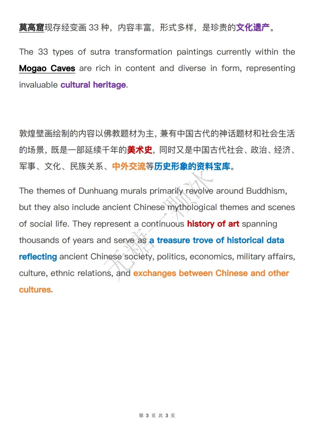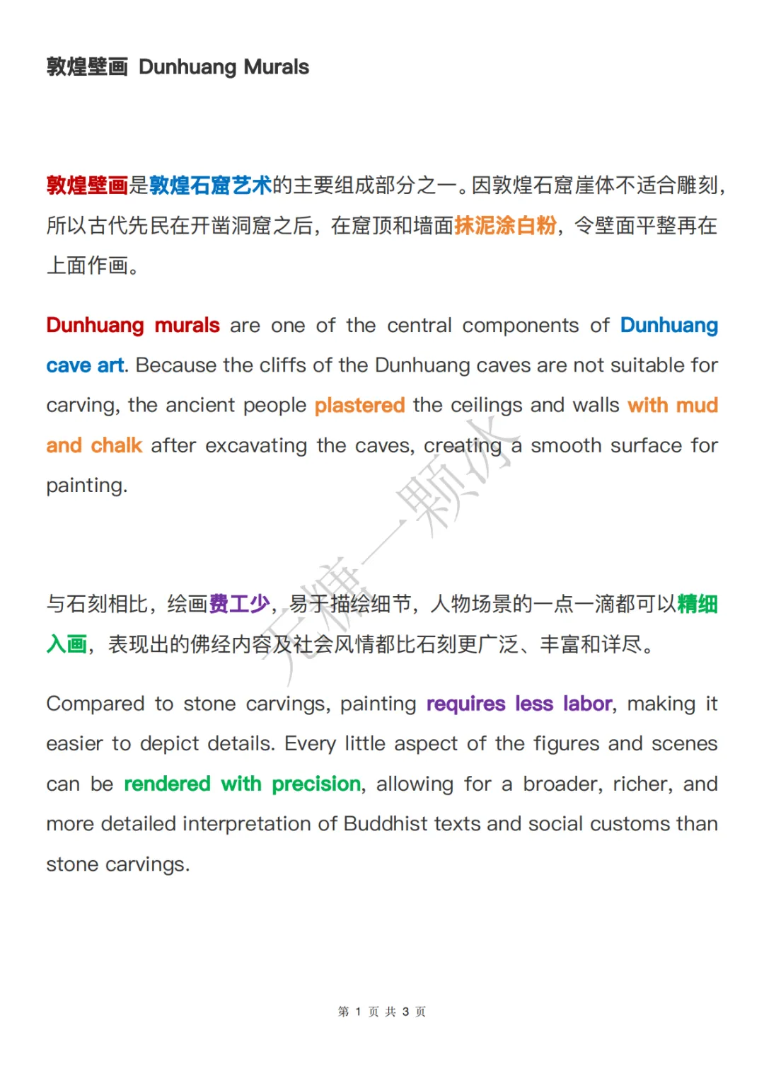 基于官方中英双语原文, 提炼20个核心词汇/固定搭配、 拆解5个长难句并附翻译技巧, 内容词汇句式比较简单, 又增加了新的词汇和知识, 可作为平时英语学习的积累。1. 敦煌壁画 Dunhuang Murals