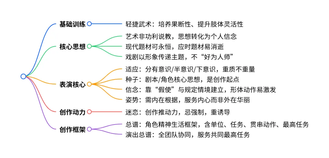 到自己身上的什么地方去寻找并且怎样去创造真实和信念呢?是不是到内心的感觉和动作里,即人-演员的心理生活领域里去找呢?可惜内心的感觉是过于复杂,不可捉摸,变幻无常,难以确定的。在心灵的领域里,真实和信念或者是自然而然地产生的,或者是通过复杂的心理技术工作才形成的。而在形体的领域里,却最容易从极细小、极平常的形体任务和动作中找到或者激起真实和信念。形体任务和动作是捉摸得到的,稳定的,看得见的,感触得到的,是服从意识和命令的。再说,它们是比较容易确定的。因此我们首先要去请教它们。借它们的帮助去接近所创造的角色。(同上,214页)