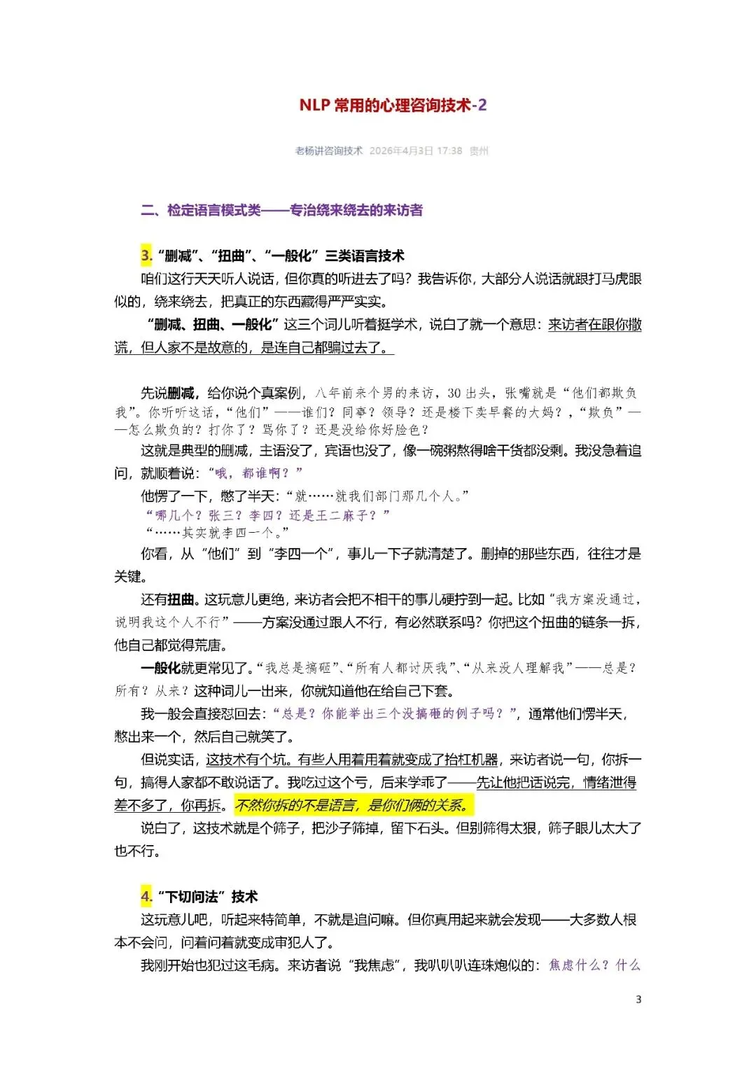 二、检定语言模式类:3.“删减”、“扭曲”、“一般化”三类语言技术4.“下切问法”技术