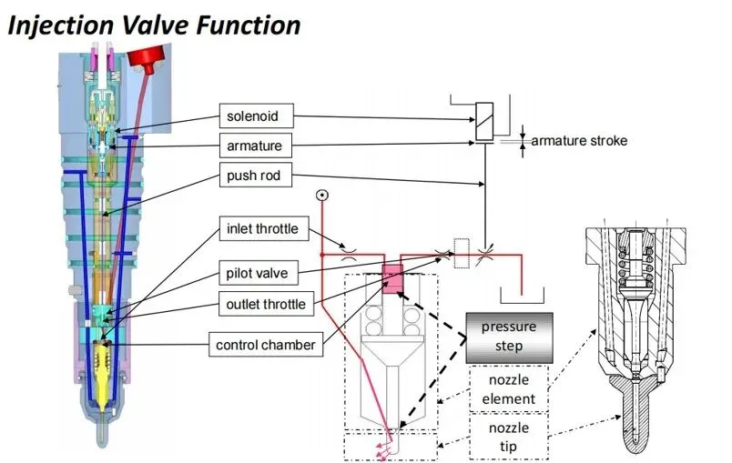 燃油共轨的高压燃油通过限流阀在电子喷油器处等待,一路控制油到达油头针阀上方,针阀上下端压力平衡,弹簧作用力与液压力的合力作用下,针阀保持关闭。当UNIC系统喷射信号发送给油头电磁阀之后,油头控制电磁阀打开,泄放油头控制油,此时针阀上下端出现压差,压差作用力克服弹簧力后顶开针阀,将燃油喷射进入气缸。