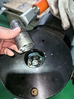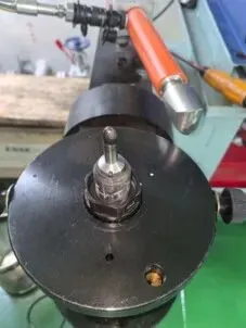旋转台架,反向用8#套筒将电磁阀压入喷油器内,完全落位后,内部的弹簧和阀芯便不会掉落。顶着电磁阀再将台架旋转回来。