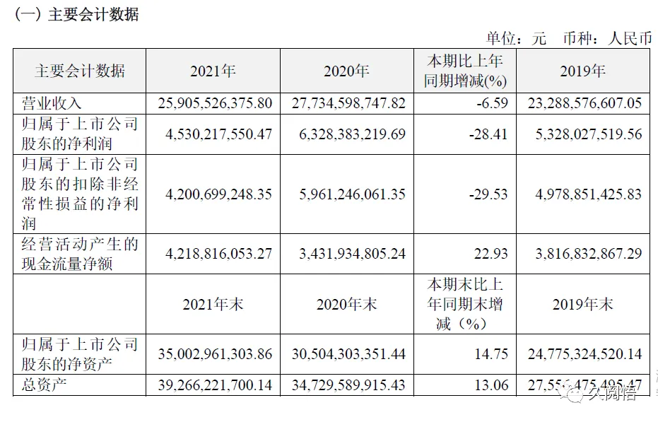 主要会计数据应该是每位投资者比较关心的,数据显示恒瑞2021年营业收入259亿,较上年度同期减少6.59%;