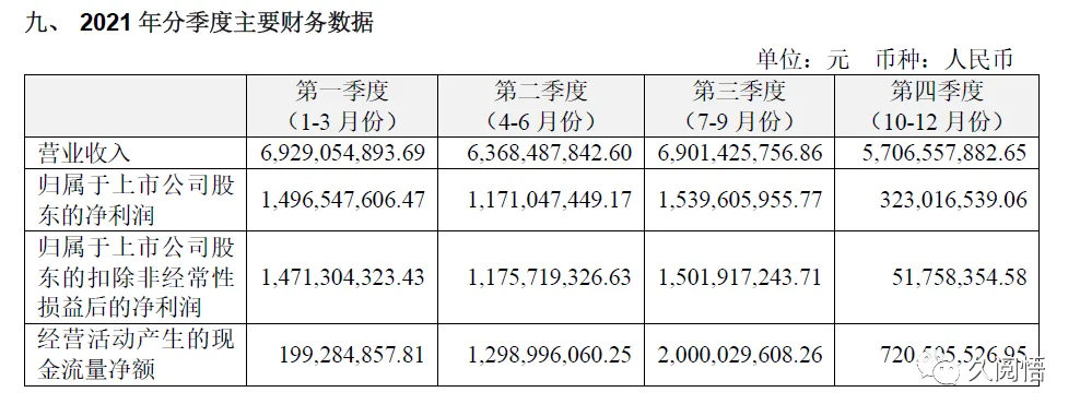 从2021年分季度财务数据来看,前三季度运营还是很稳定的,营收额都能达到60亿以上,净利润在12~15亿之间,如果稳定发展不考虑增长,年度净利润额应该能到50亿,然而现实是残酷的,第四季度营收有小幅降低,扣非净利润却是断崖式下降,只有三季度的零头5000多万,看来四季度发生了一些事情直接影响净利润,是什么事情呢?