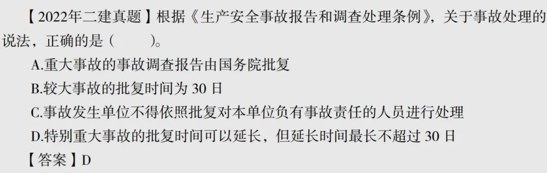 (1)重大事故、较大事故、一般事故,负责事故调查的人民政府应当自收到事故调查报告之日起15日内做出批复;特别重大事故,30日内做出批复;特殊情况下,批复时间可以适当延长≤30日。